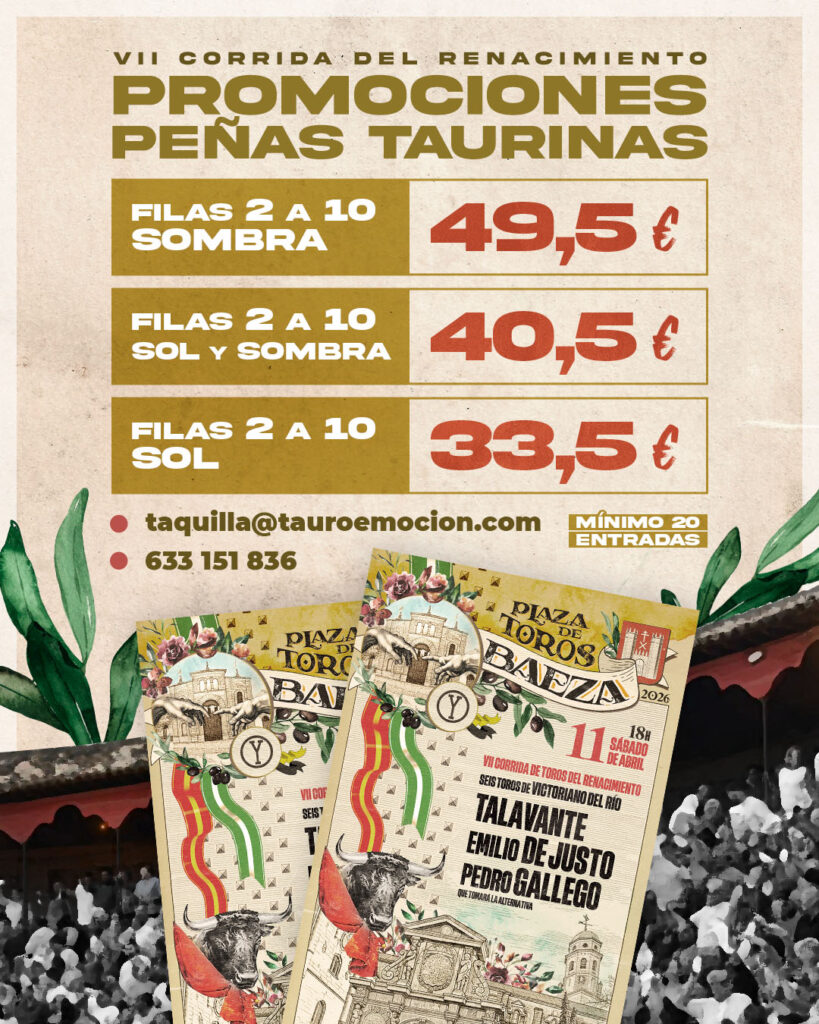 Estas tarifas especiales buscan facilitar la participación de aficionados y asociaciones taurinas en una cita que combina tradición, patrimonio y espectáculo en el incomparable marco de la ciudad renacentista de Baeza.